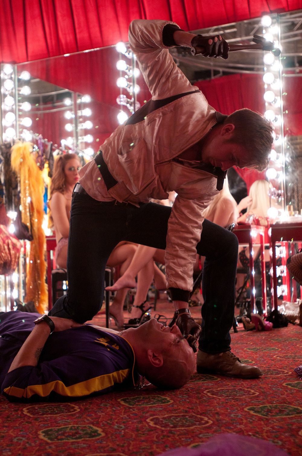 At the auto shop, the Driver's arm is bandaged from the shotgun pellets, and Shannon offers him to hide the money, but he refuses. He finds Cook in a strip club, smashes his fingers with a hammer and threatens to kill him, so Cook reveals that Nino was behind the robbery. The Driver decides to return the million, but Nino dismisses the offer and instead sends a hitman (Jeff Wolfe) to the Driver's apartment building. Entering the elevator with Irene, the Driver encounters the hitman and spots his pistol. The Driver kisses Irene before violently beating the hitman to death. Irene exits stunned.