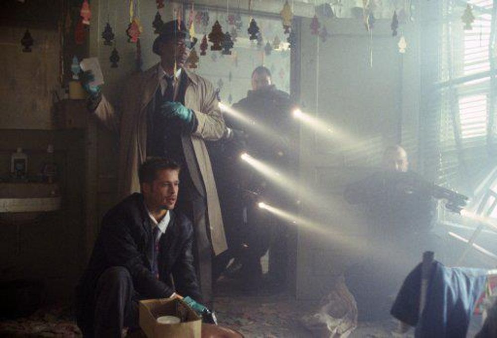 While examining Doe's apartment (after bribing a resident to claim she called the detectives about Doe) they find notebooks of his thoughts, trophies of the crimes and a picture of Mills fighting off Doe, who, at the time, was posing as a press photographer. John Doe calls the apartment and congratulates the detectives on them finding him and apologizes for hitting Mills.